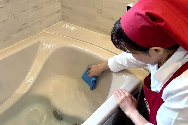 浴槽は業務用の吸水クロスでなでて軽い汚れを落とし、お湯をかけ、よく絞った吸水クロスで水滴を拭き取ります。