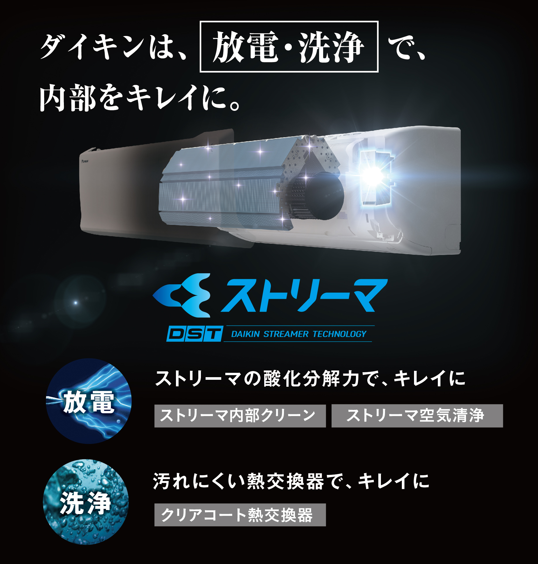 ◎ダイキン独自の技術「ストリーマ内部クリーン」で冷房・除湿運転の停止後、自動的にストリーマ照射と送風・暖房で乾燥を行います。