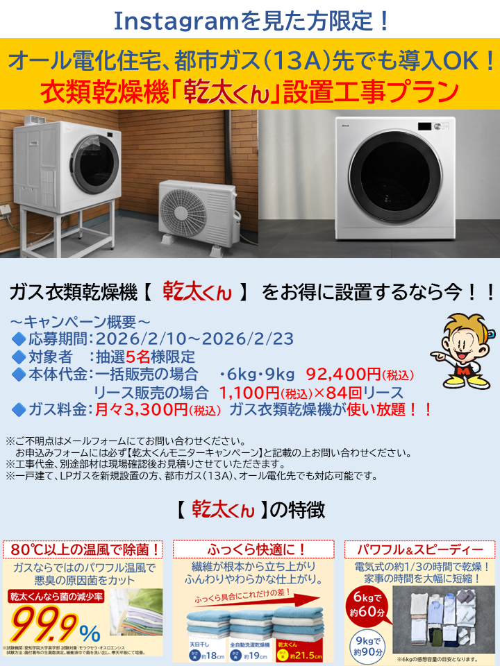 ※回答・コメント欄に必ず【乾太くんモニターキャンペーン】とご記載ください。